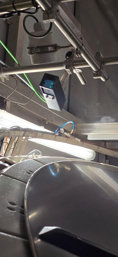 Vi monterte et kompakt, intelligent kamera med innebygd prosessor direkte over det sirkulære transportbåndet. Systemet dekoder den nøyaktige retningen på over 600 flasker per minutt, og håndterer både ultra-gjennomsiktig plast og svært reflekterende overflater uten problemer.